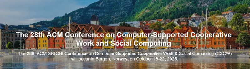 The ACM Conference on Computer-Supported Cooperative Work and Social Computing (CSCW) 会议是人机交互与普适计算方向的权威国际学术会议(CCF A类推荐国际会议),涵盖了计算机网络与通信技术、多媒体技术、社会学、心理学、管理科学等多门学科的综合应用,在人机交互领域享有很高的学术声誉。该会议计划于2025年10月18日至10月22日在挪威卑尔根召开。