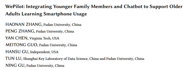 日前,实验室硕士生张浩男作为第一作者的论文“WePilot: Integrating Younger Family Members and Chatbot to Support Older Adults Learning Smartphone Usage”被CCF A类会议The ACM SIGCHI Conference on Computer-Supported Cooperative Work & Social Computing (CSCW)会议录用。该论文是复旦大学计算与智能创新学院与老龄研究院跨学科研究团队AI4SS(AI for Social Science)的最新研究成果。