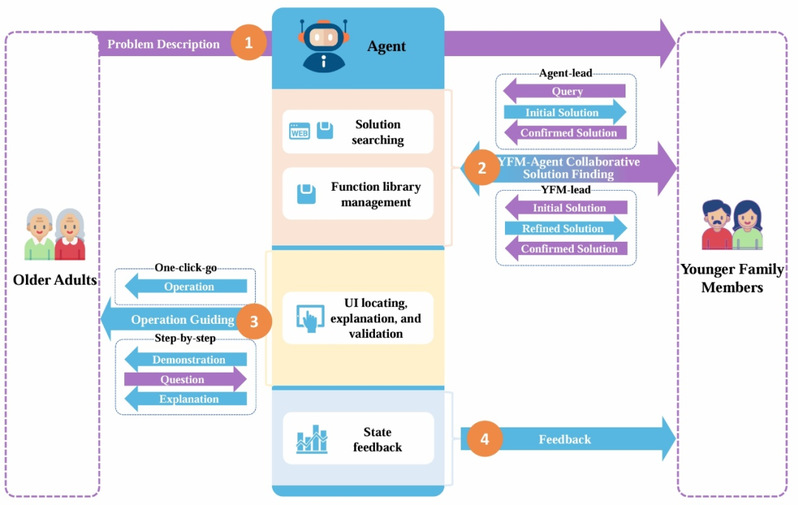 为此,我们开展了一项系统性的研究,旨在探索如何将聊天机器人合理嵌入老年人与年轻家庭成员之间的技术支持互动中,从而提升协作效率、缓解代际矛盾,并构建一个更加可持续、低负担、高情感价值的帮助机制。