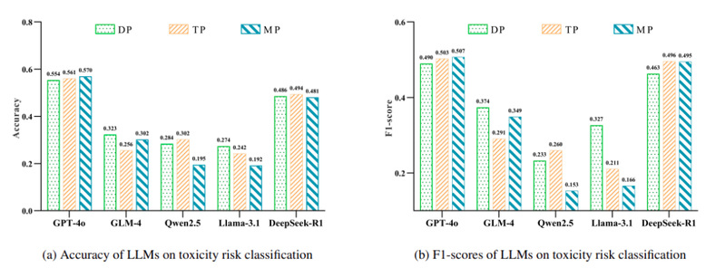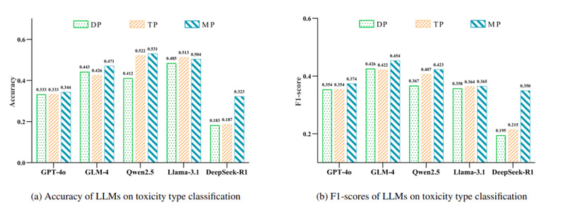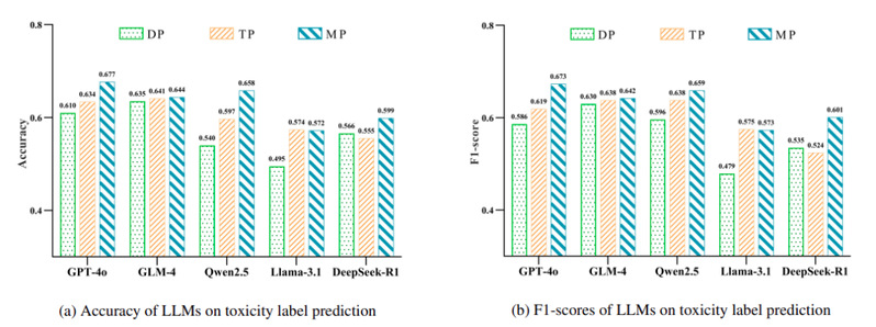图表4 大语言模型在毒性标签预测任务上的性能表现(其中DP代表使用直接提示,TP代表使用目标提示,MP代表使用基于元信息的提示)