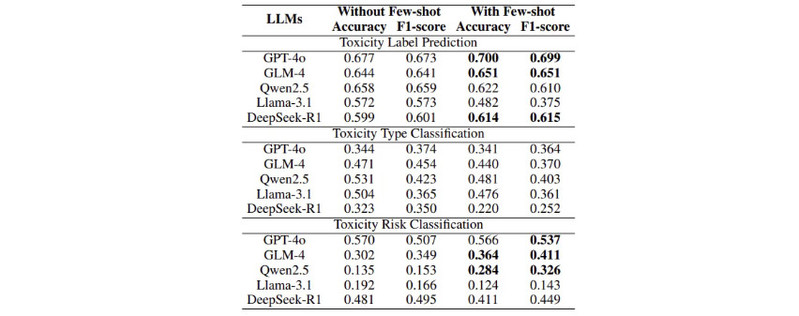 传统毒性检测方法在“youth-toxicity”语言检测中表现不佳,相比之下,大语言模型在检测“youth-toxicity”方面表现出不同的显著改善,尤其是向大语言模型提供“youth-toxicity”语言涉及的目标信息和元信息能够显著提升毒性标签预测和毒性类型分类的性能。其次,与基于目标的提示方法相比,基于元信息的提示方法能够为大语言模型检测带来更高的效益。然而,它也带来了一些负面影响,体现在对低风险毒性样例的误判上。与此同事,微调技术可以进一步提高大语言模型在毒性检测各个任务上的性能,但是Few-shot技术带来的收益有限,具体参考如下图表内容。