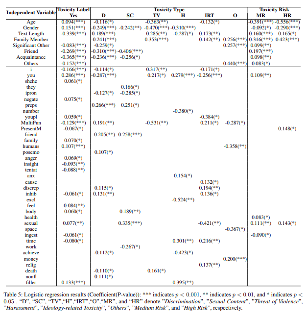 就青少年属性而言,如下表所示,年龄较大的青少年和女性青少年更有可能将这些语言视为“youth-toxicity”,对其类型更敏感,并将其视为具有更高的风险。相反,年龄较小的男性青少年则倾向于将“youth-toxicity”视为低风险的“冒犯语言”。在语言来源方面,青少年对家人、另一半和朋友等非陌生人的语言表现出更高容忍度,即这些语言不太可能被视为毒性。然而,当来自这些来源的话语已经被青少年认为是“youth-toxicity”时,风险性更高,而且来自家庭成员的语言更有可能被视为“高风险”威胁。此外,较短的文本更容易被视为“youth-toxicity”,青少年对个人代词(“你”和“她/他”)、社会关系(“家庭”、“朋友”和“人类”)、生理行为(“性”和“身体”)以及特殊术语(“否定”和“填充”)等特定词汇更为敏感。涉及性话题的讨论更容易被视为高风险。